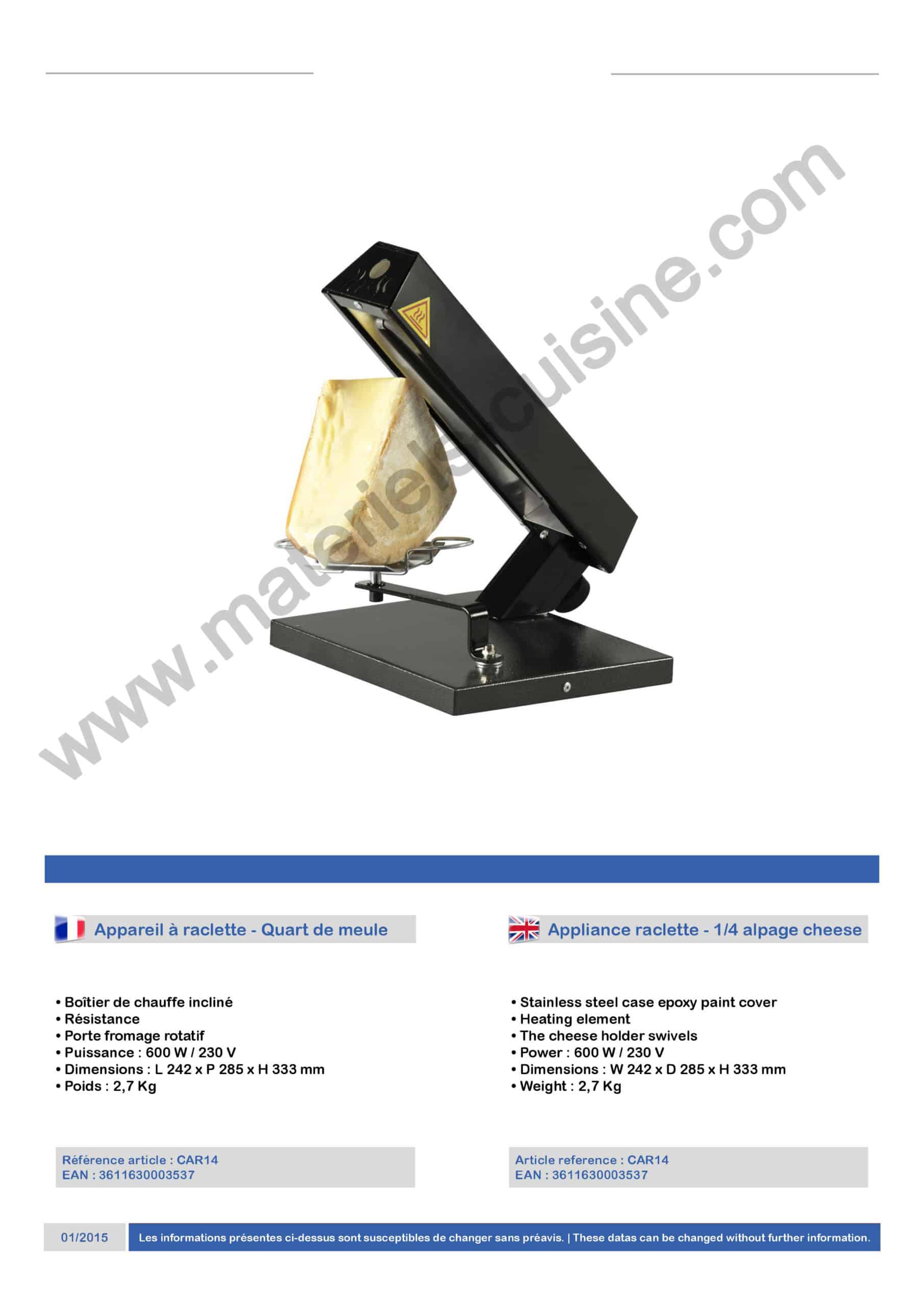 - Chauffe efficace : Équipé d’une résistance puissante pour faire fondre rapidement et uniformément le fromage.