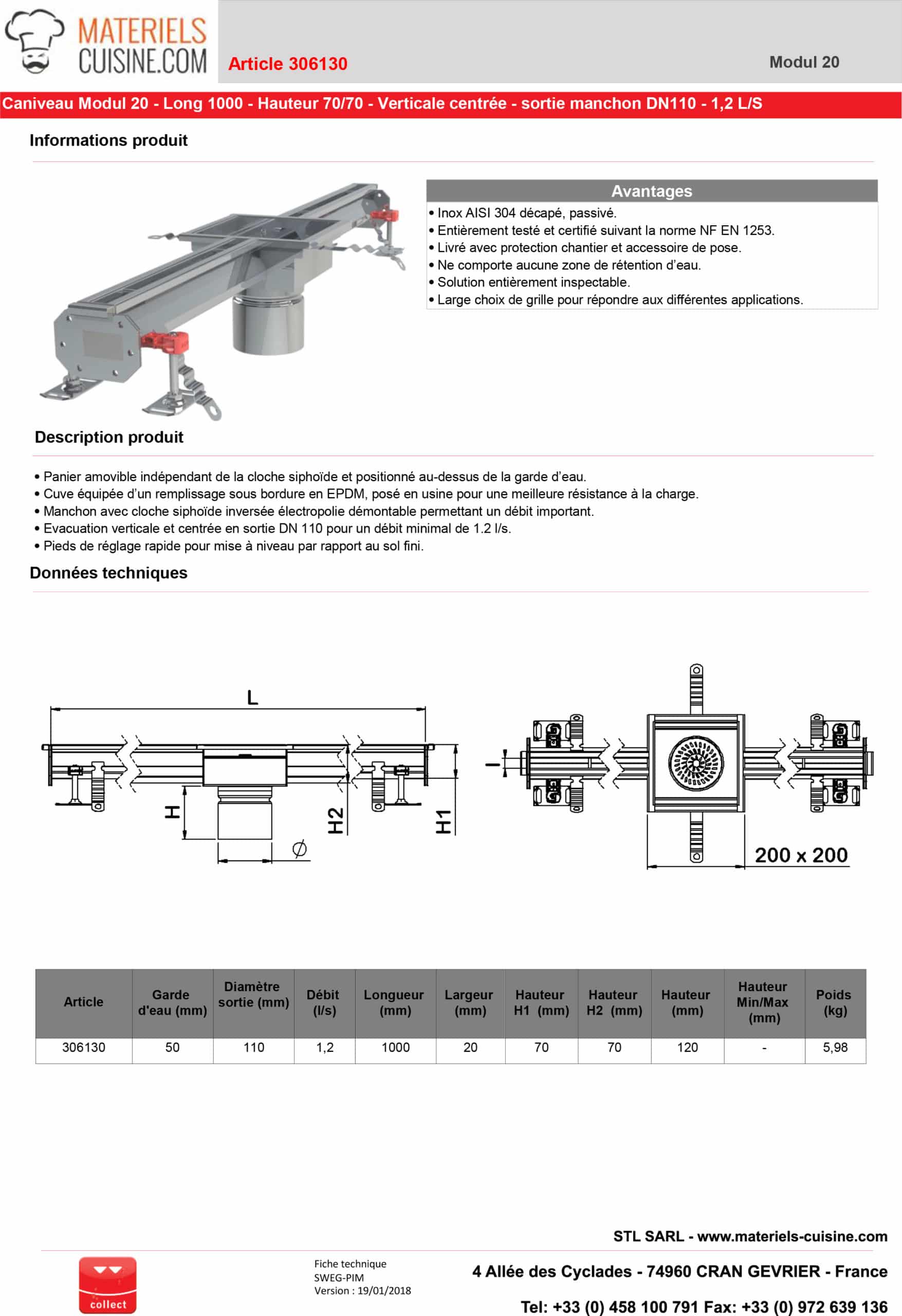 Caniveau Modul 20 sortie verticale centrée DN110 avec boitier siphon 200 x 200 mm Longueur 1000 mm
