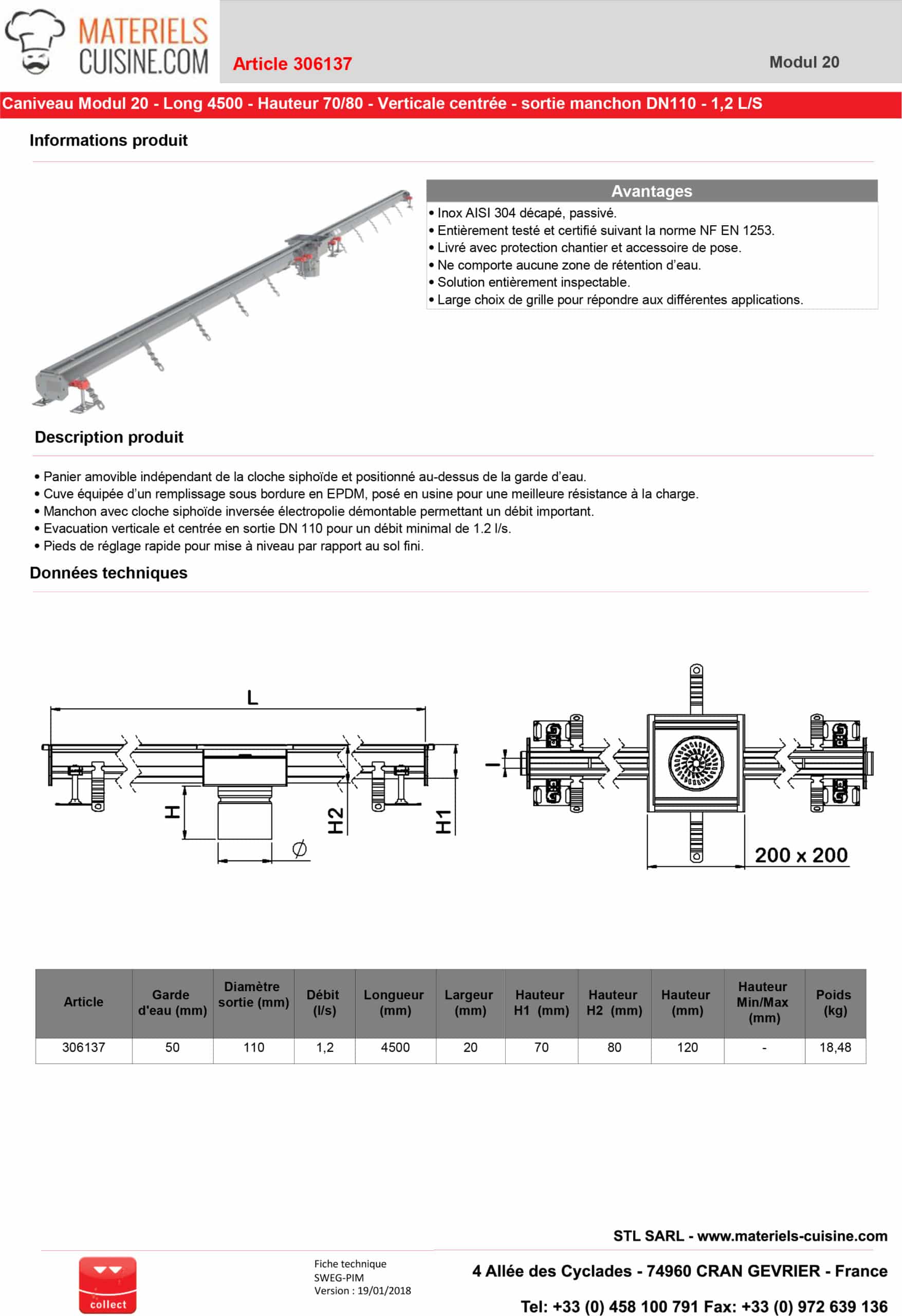 Caniveau Modul 20 sortie verticale centrée DN110 avec boitier siphon 200 x 200 mm Longueur 4500 mm