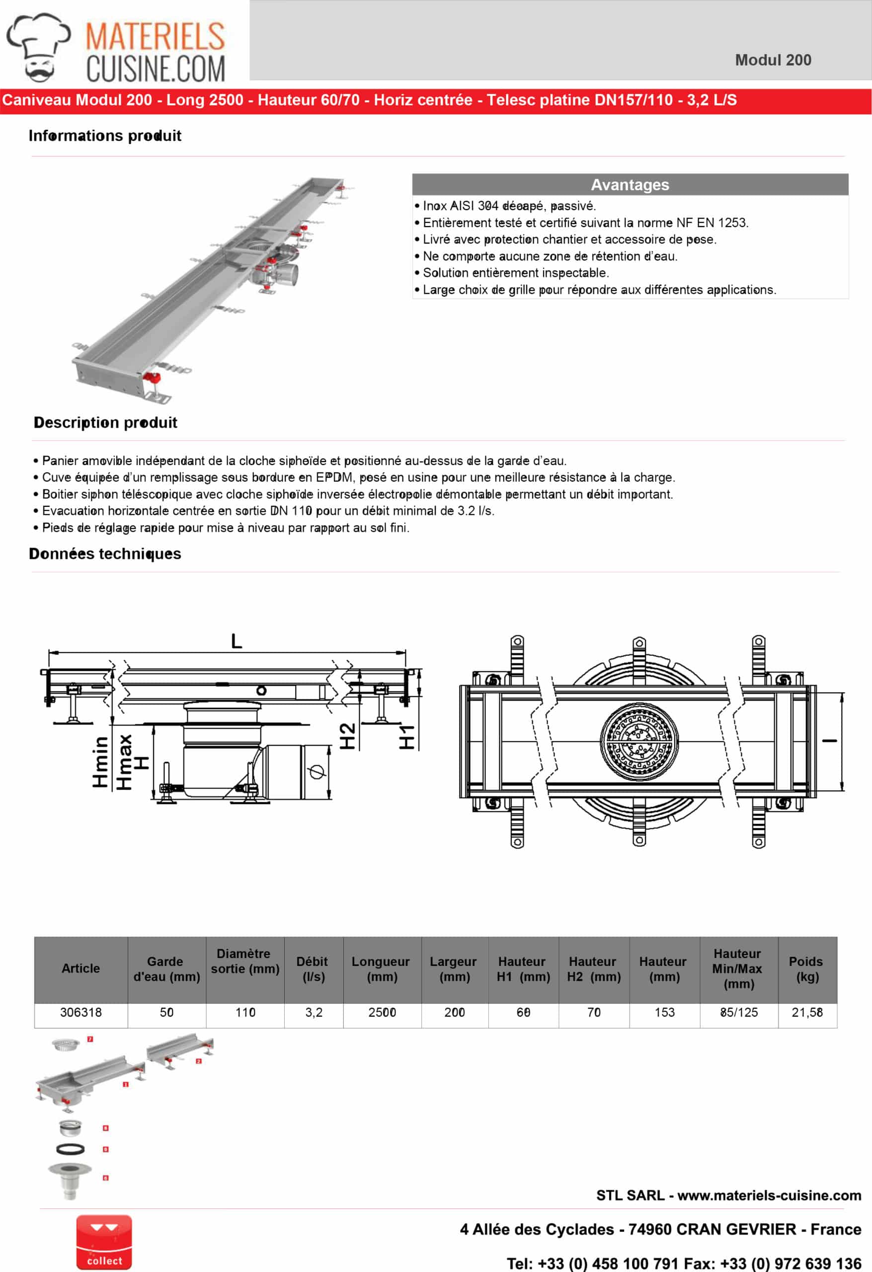 Caniveau en Inox Modul 200 L – 2500 mm, Sortie Horizontale Centrée Boitier 157/DN110