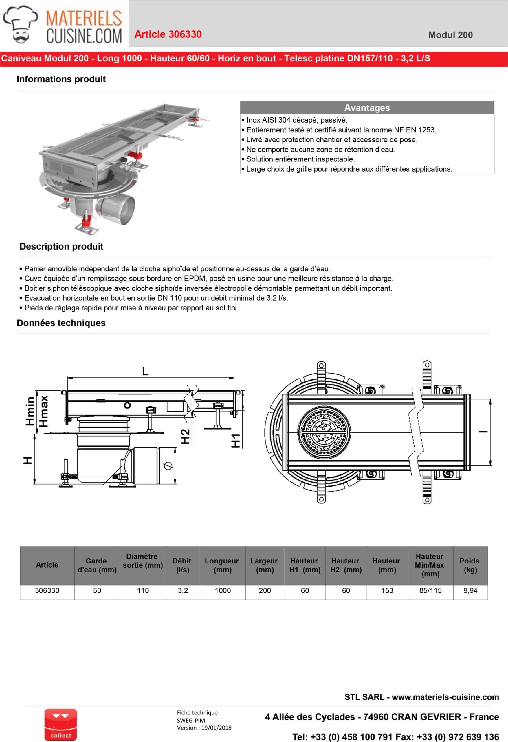 - Normes respectées : Entièrement testé et certifié selon la norme NF EN 1253, assurant sécurité et fiabilité.
