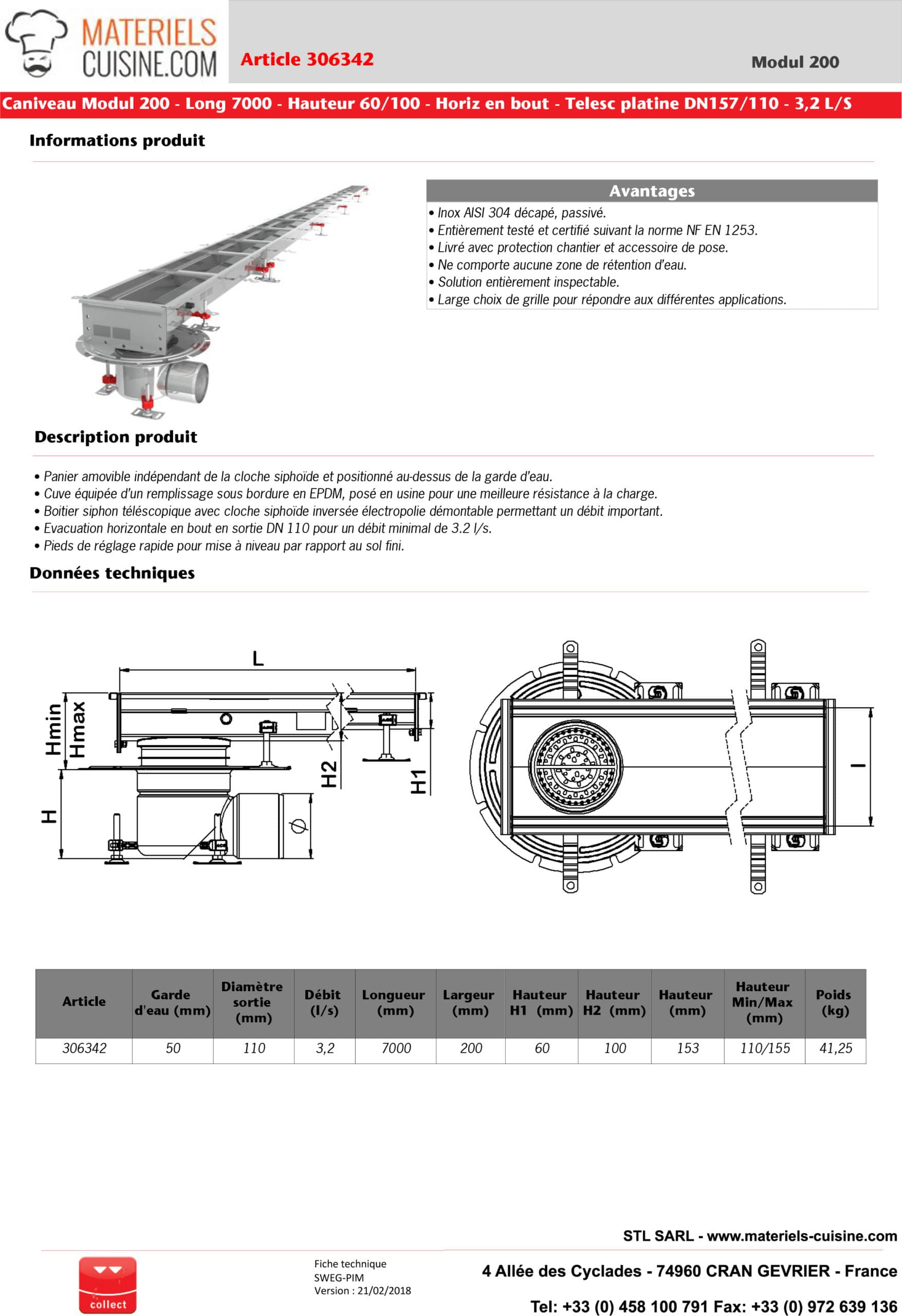 Caniveau Modul 200 sortie horizontale en bout boitier 157/DN110 Longueur 7000 mm