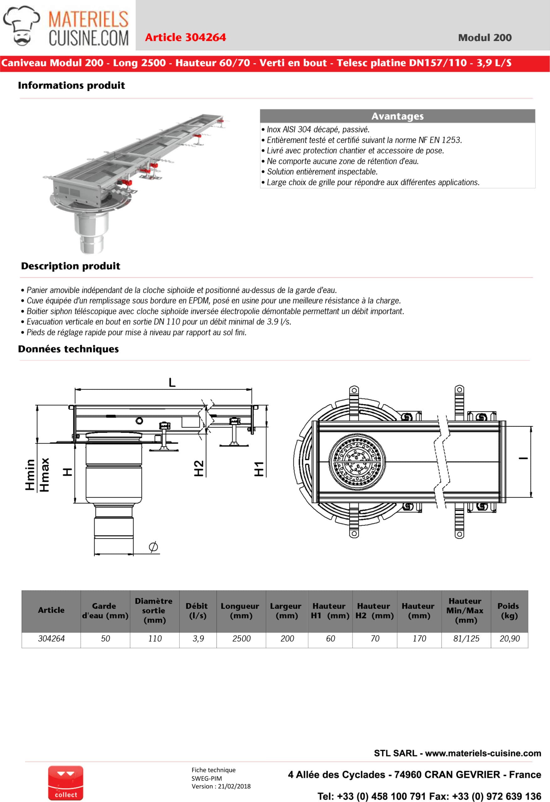 - Normes respectées : Entièrement testé et certifié suivant la norme NF EN 1253, garantissant sécurité et fiabilité.