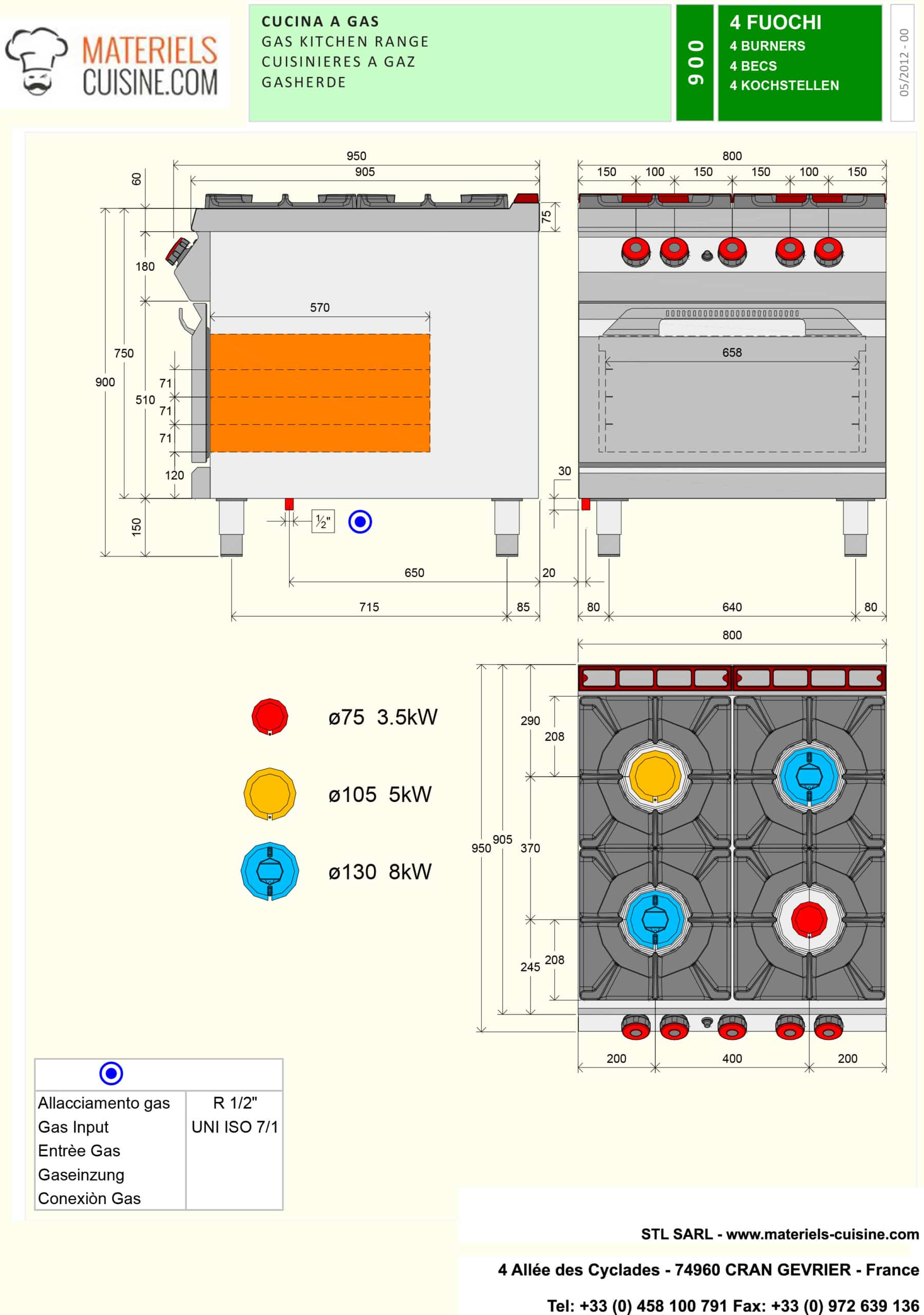 - Brûleurs : 4 brûleurs verticaux (3,5 kW, 5 kW et 8 kW) mono et double couronne
