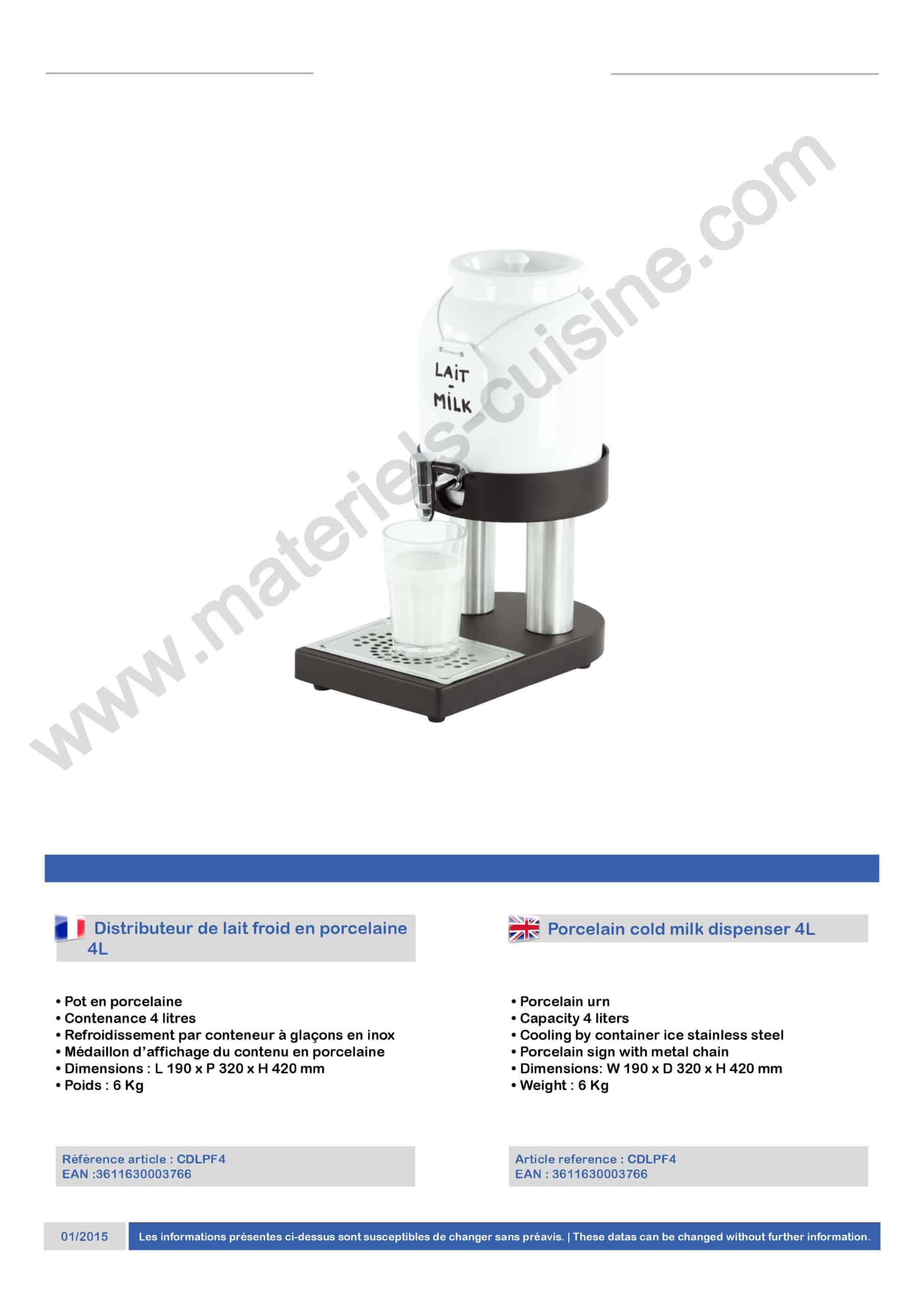 Distributeur de lait froid en porcelaine 4 L