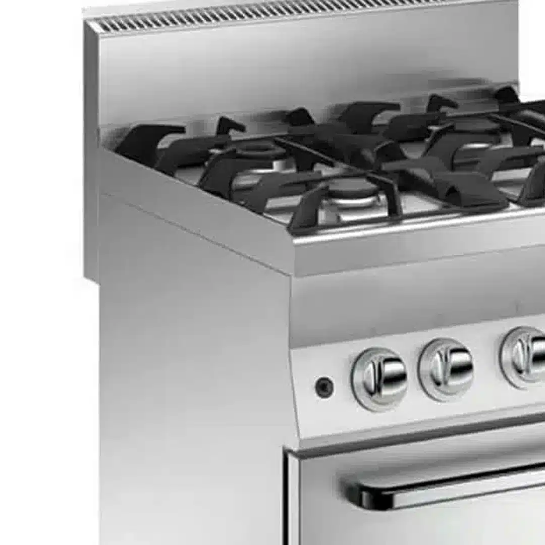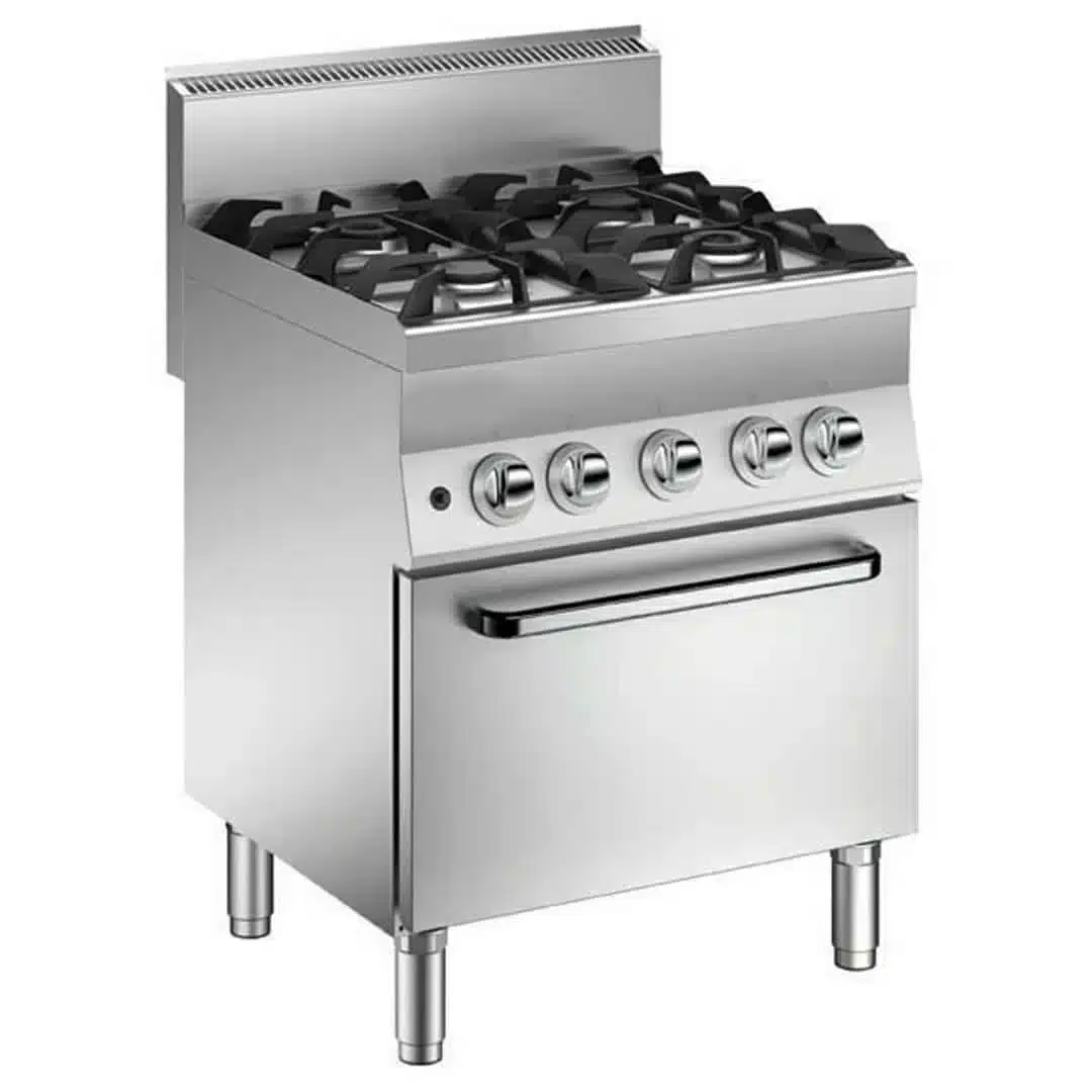 Fourneau 4 feux vifs gaz sur four gaz, permet de réaliser plusieurs préparations simultanément, idéal pour les professionnels de la restauration.