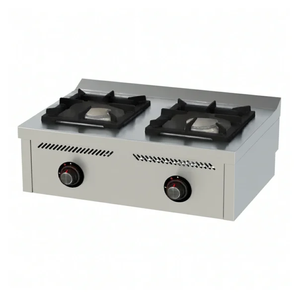 Fourneau à gaz professionnel 2 feux, série 600, idéal pour les petits espaces et les plans de travail. Puissance et robustesse pour une utilisation quotidienne et intensive en cuisine.