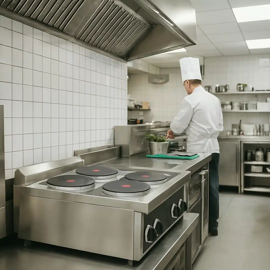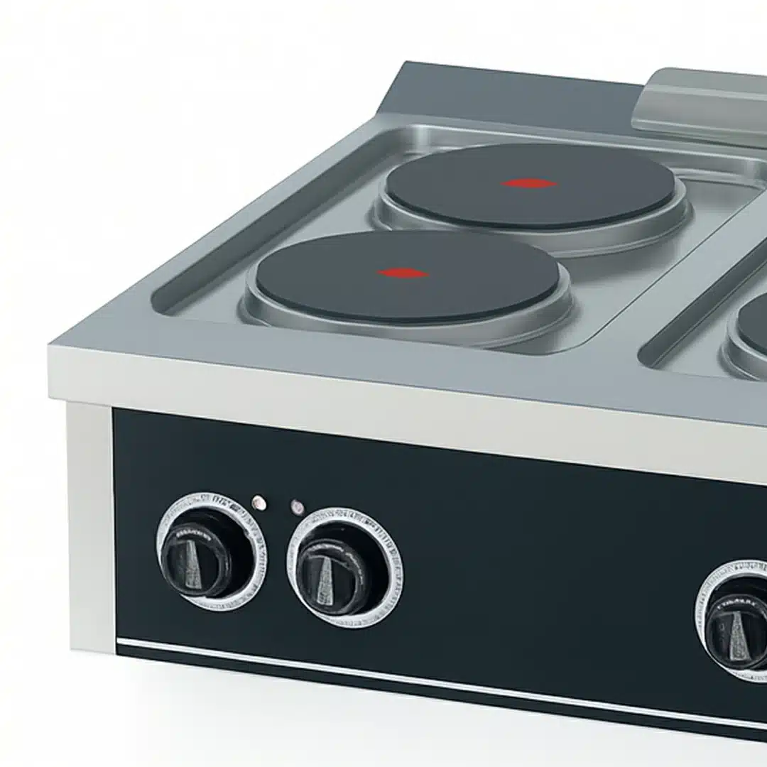 Fourneau électrique professionnel à 4 plaques, compact et puissant, garantissant une cuisson rapide et uniforme. Parfait pour maximiser votre espace de travail, il est conçu pour les professionnels de la restauration.