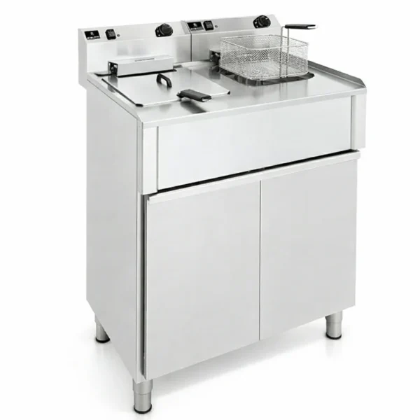 Friteuse électrique gros volume 400 V avec deux cuves de 12 L, parfaite pour préparer de grandes quantités de frites. Son système de vidange tri facilite le nettoyage et l’utilisation en cuisine professionnelle.
