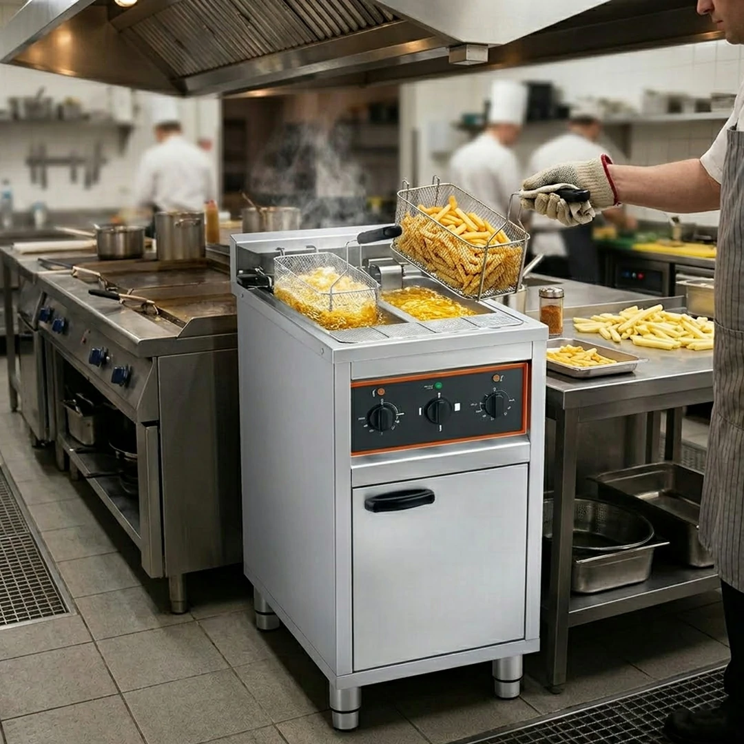 Friteuse gros volume sur coffre électrique avec vidange 2 cuves 2 x 10 L – Solution Idéale pour Fritures en Gros Volume