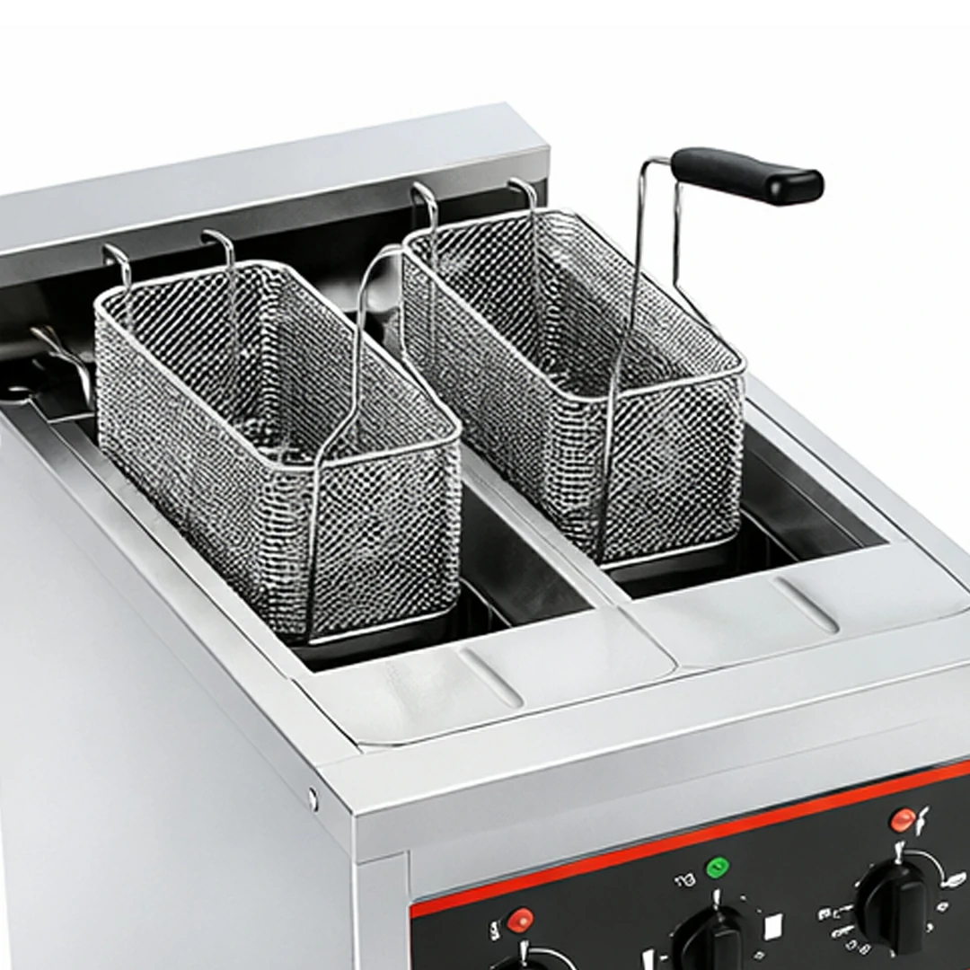 Friteuse gros volume électrique avec vidange, équipée de 2 cuves de 10 L chacune. Idéale pour une cuisson rapide et efficace, cette friteuse est parfaite pour les professionnels de la restauration.