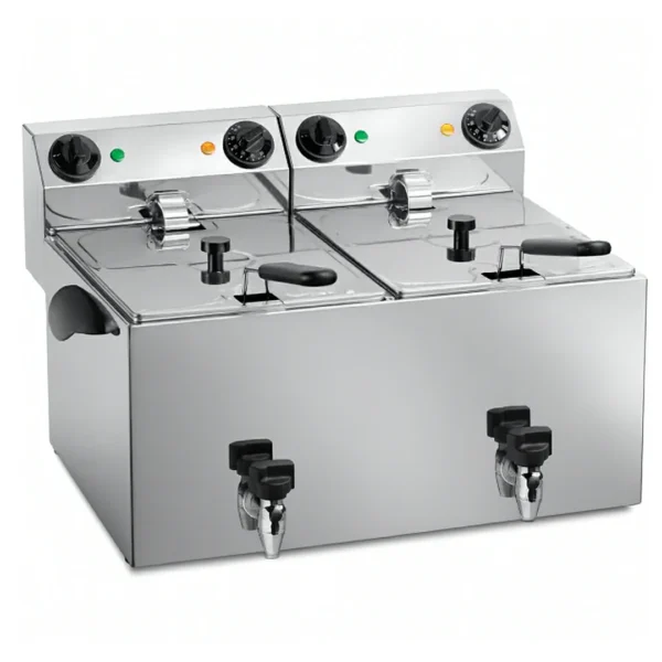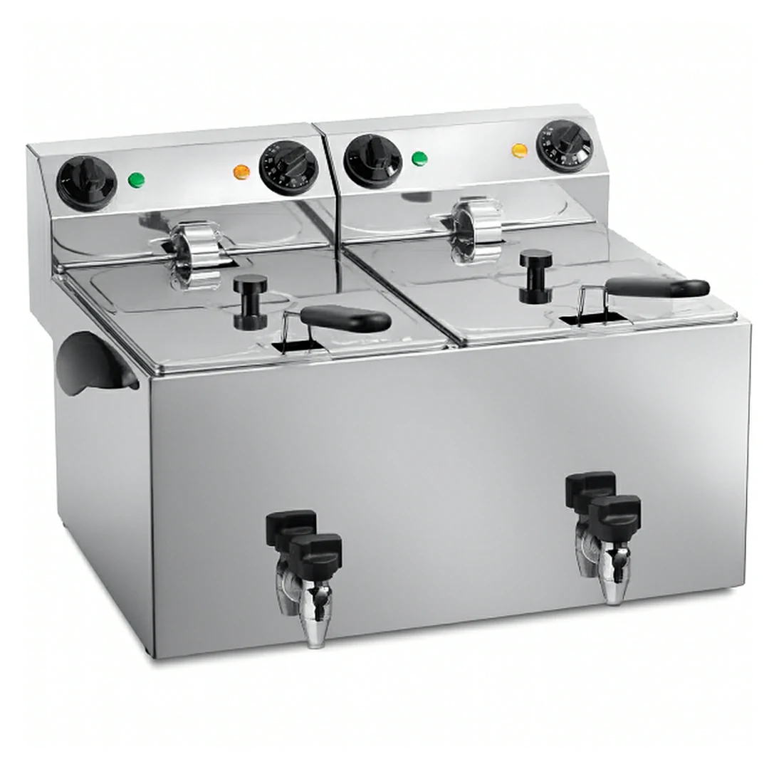 Friteuse inox avec robinet de vidange, 2 cuves de 8 L pour une cuisson efficace. Idéale pour des fritures croustillantes et un nettoyage simplifié.
