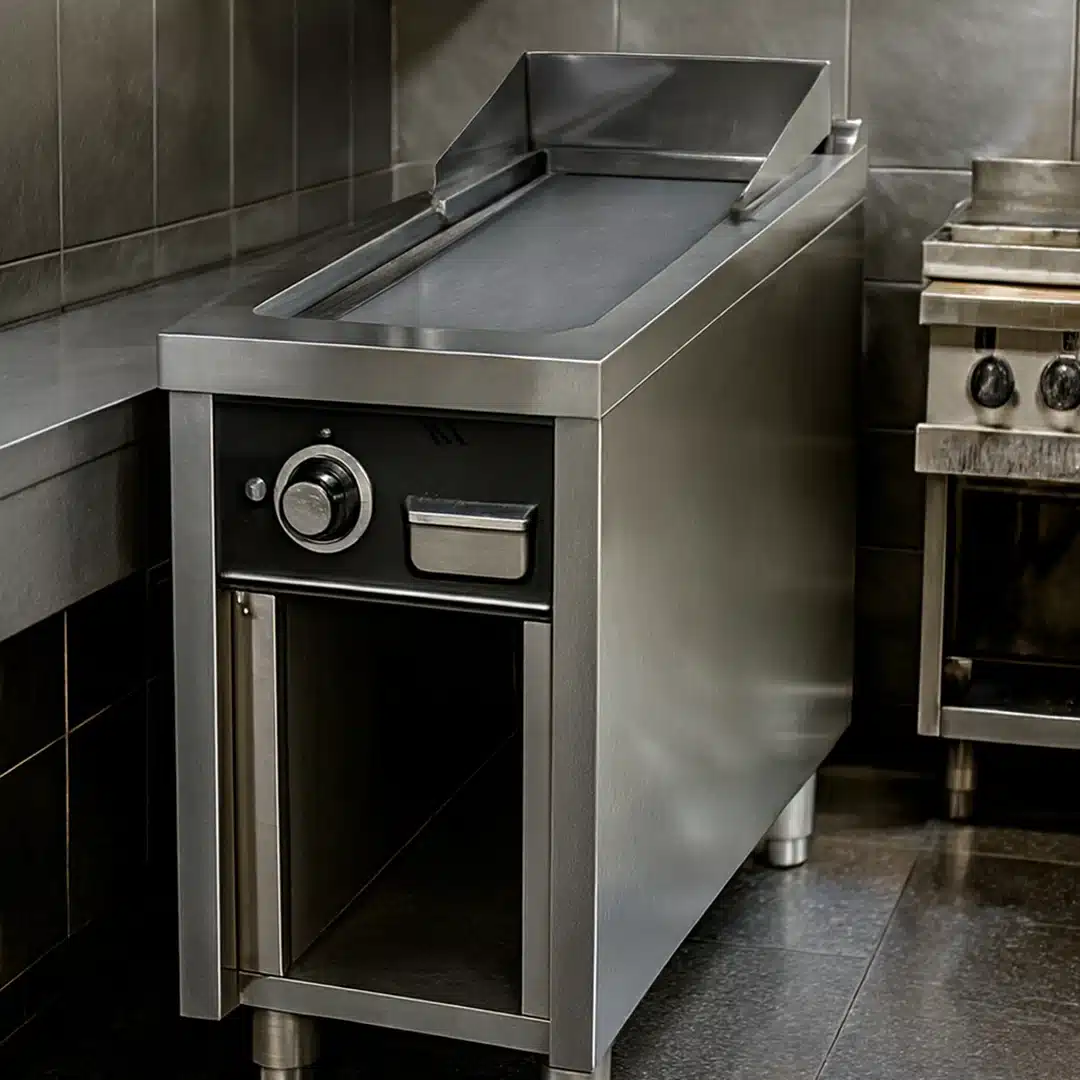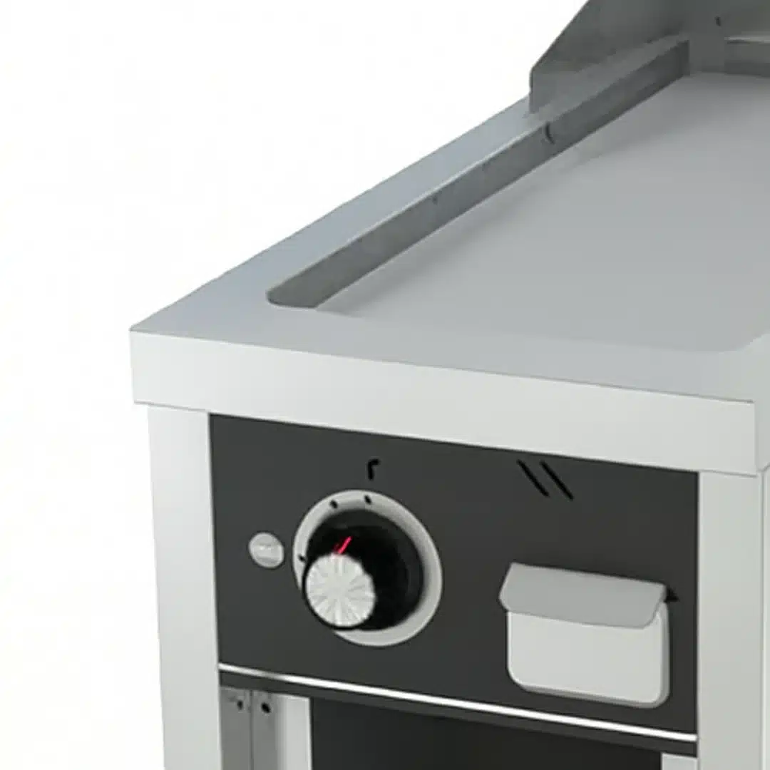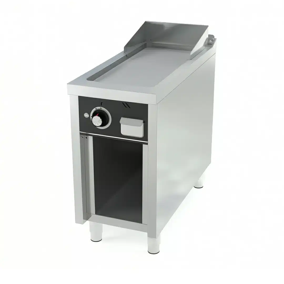 Fry-top à gaz série 900 en acier rectifié de 400 mm sur placard, idéal pour une cuisson rapide et homogène. Compact et robuste, il s’adapte parfaitement à votre cuisine professionnelle.