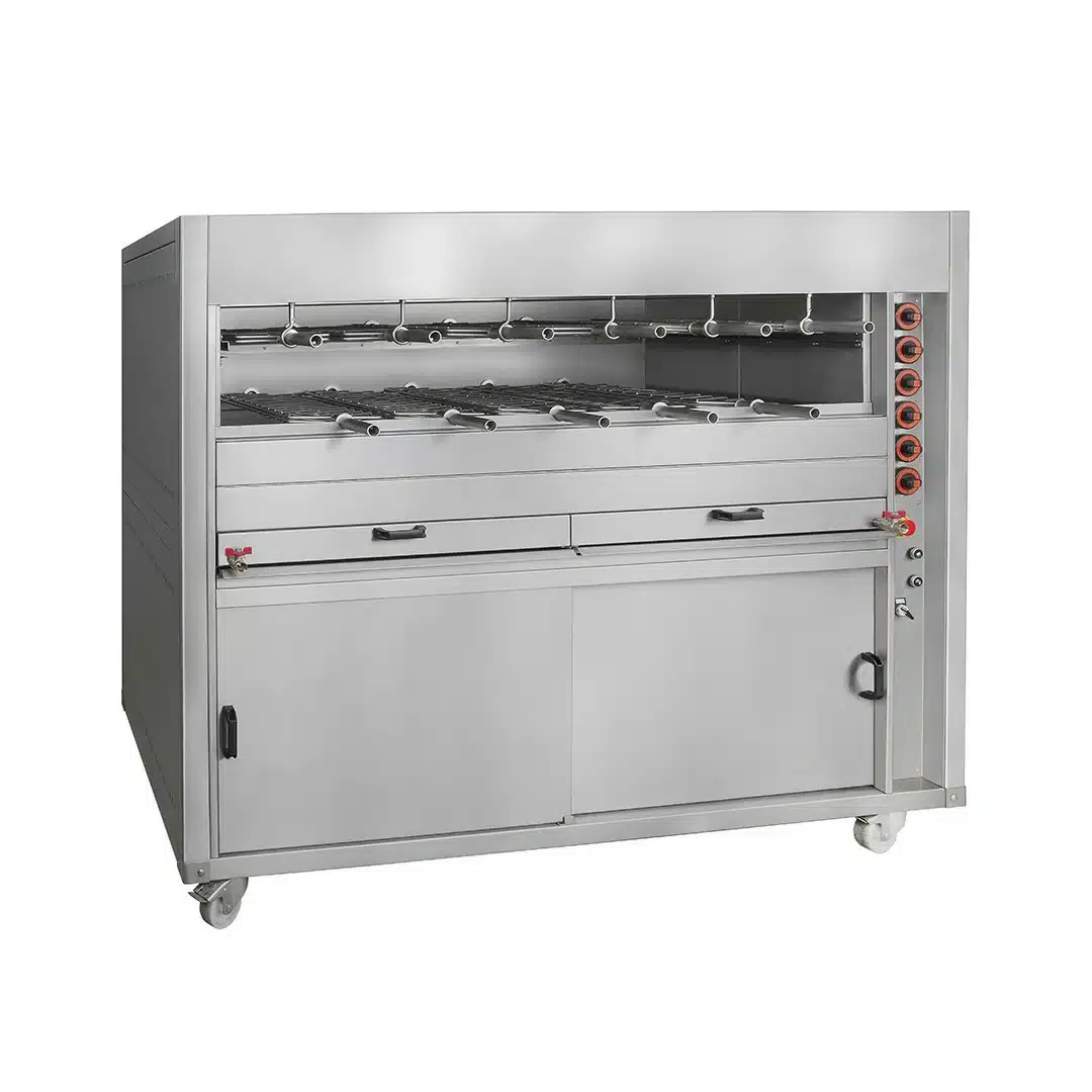 Grill rotatif gaz multifonctions, idéal pour les cuisines centrales, les traiteurs, les restaurants de grillade. Parfait pour une cuisson homogène, rapide et sans surveillance constante.
