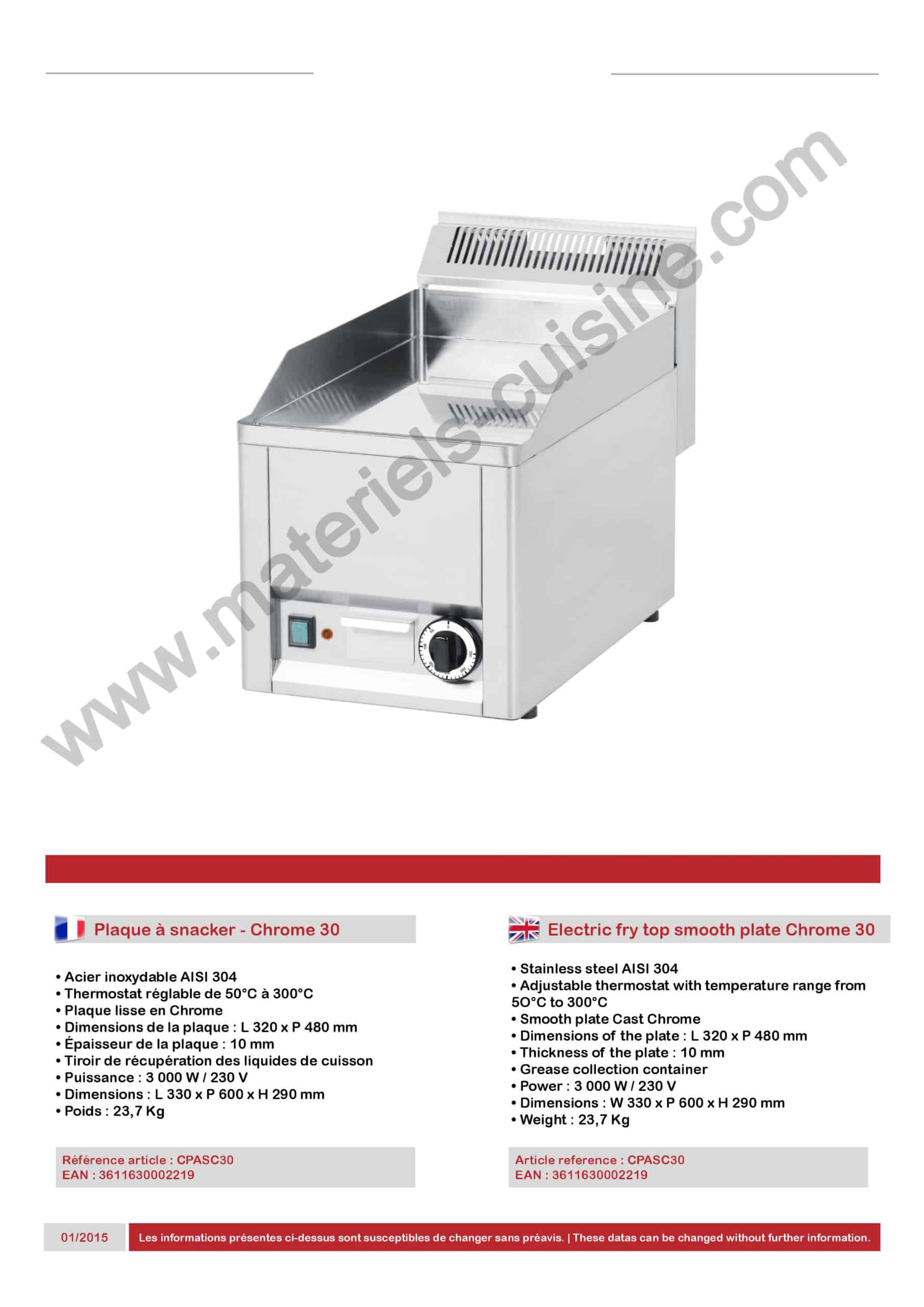 Plaque à snacker Chrome 30 en acier inoxydable AISI 304, 3000 W