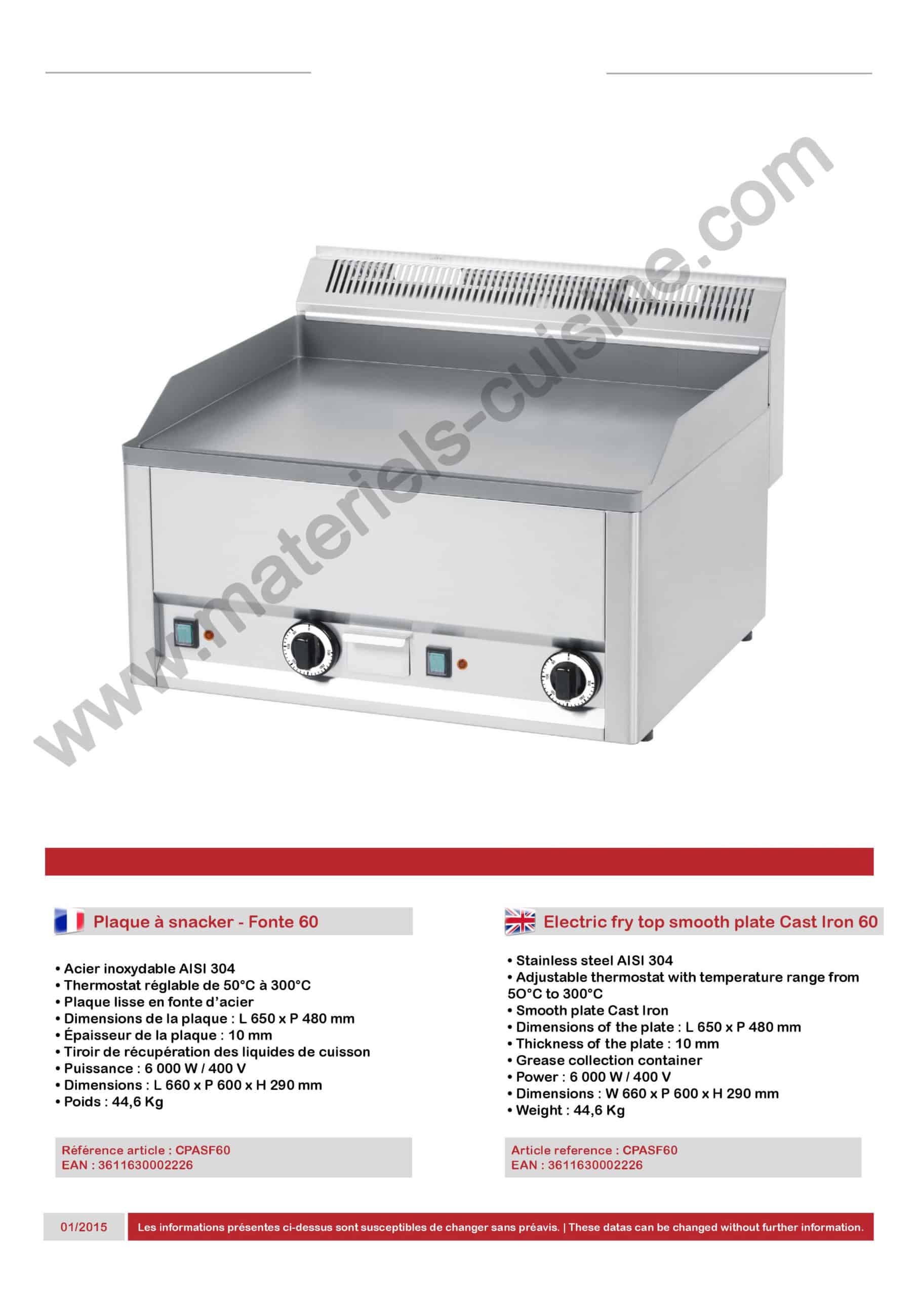 Plaque à snacker Fonte 60 en acier inoxydable AISI 304, 6000 W