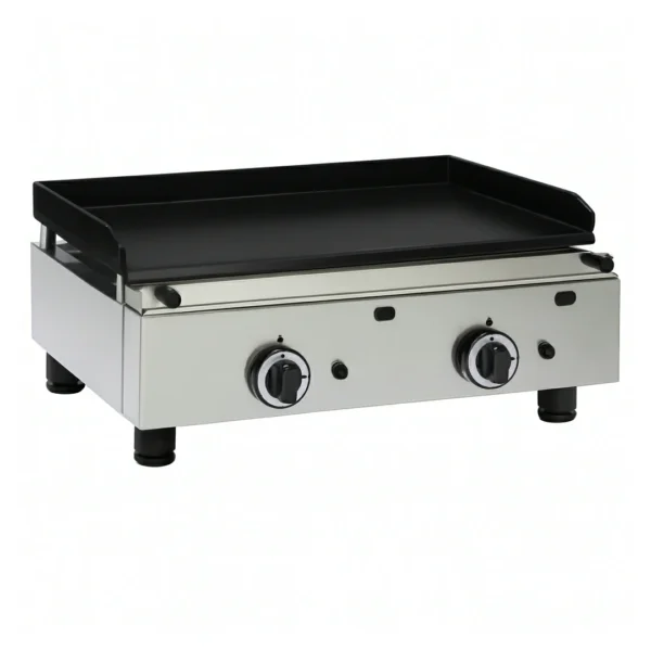 Son brûleur à gaz haute puissance offre une montée en température rapide et uniforme, facilitant ainsi la cuisson de vos mets avec précision. Le revêtement en céramique anti-adhésive assure un nettoyage facile, permettant aux chefs de se concentrer sur leur créativité culinaire sans se soucier des résidus collés. De plus, le bac collecteur de jus intégré en façade simplifie l’entretien, réduisant le temps consacré à la maintenance.