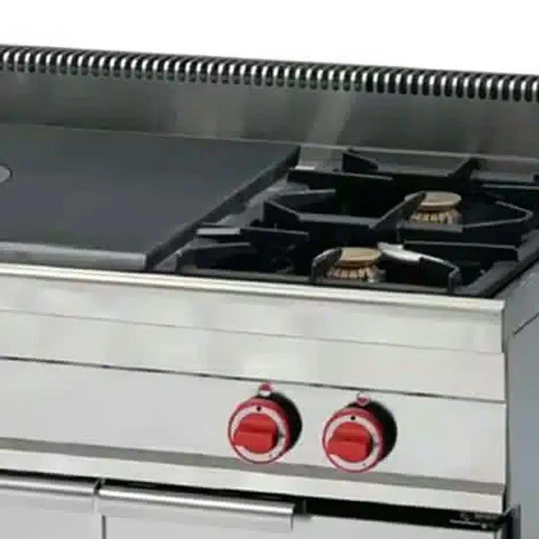 Plaque coup de feu à gaz avec 2 feux vifs sur four et placard fermé, conçu pour les cuisines professionnelles exigeantes, offrant une solution complète alliant puissance, polyvalence et durabilité.