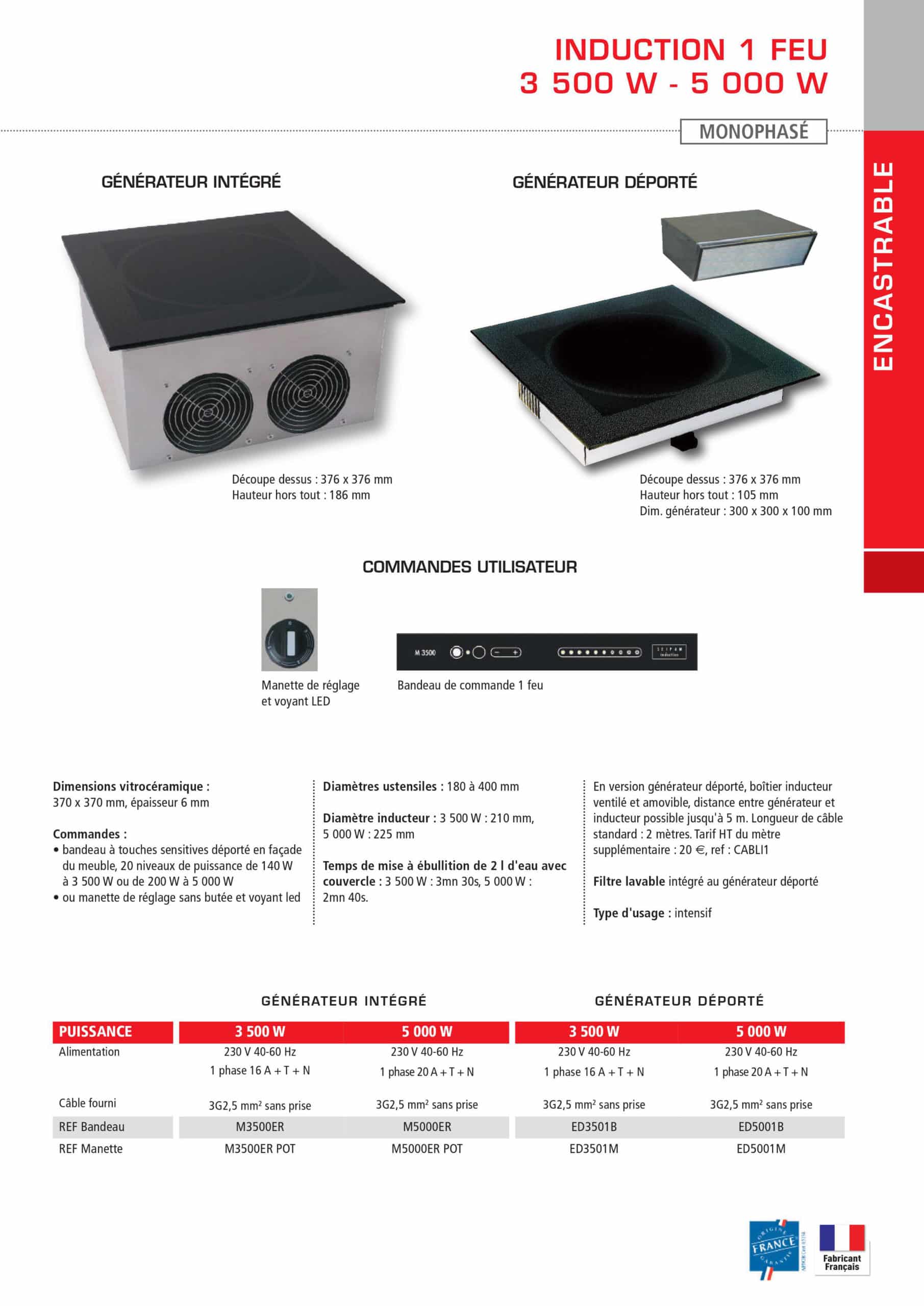 Plaque induction encastrable 1 foyer – 3 500 W, générateur intégré