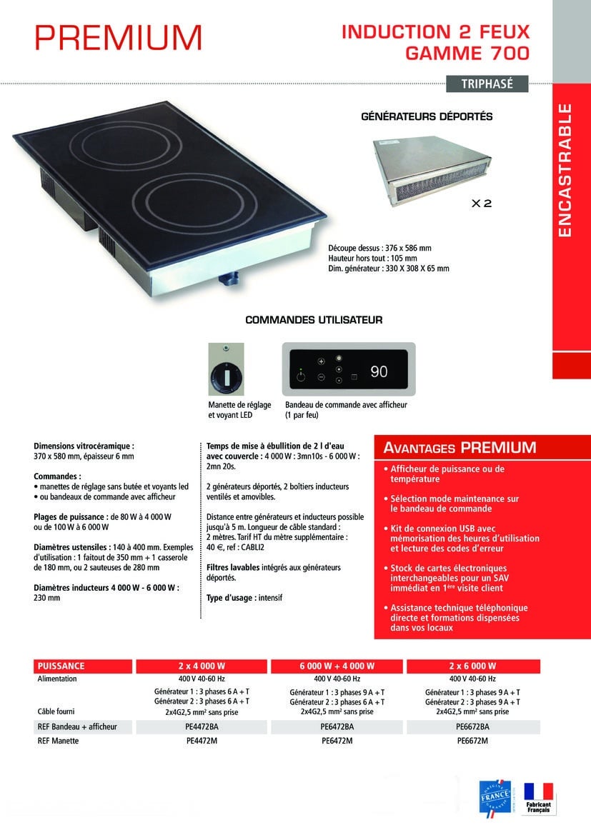 Plaque induction encastrable triphasée Gamme 700 2 foyers – 2 × 4 000 W, triphasé