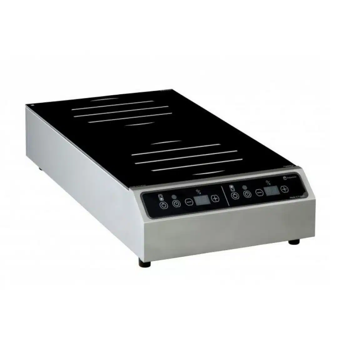 Plaque induction, double foyer, à usage intensif, avec une commande à touches sensitives (On/Off), offre des possibilités de cuisson variées et extrêmement précises.