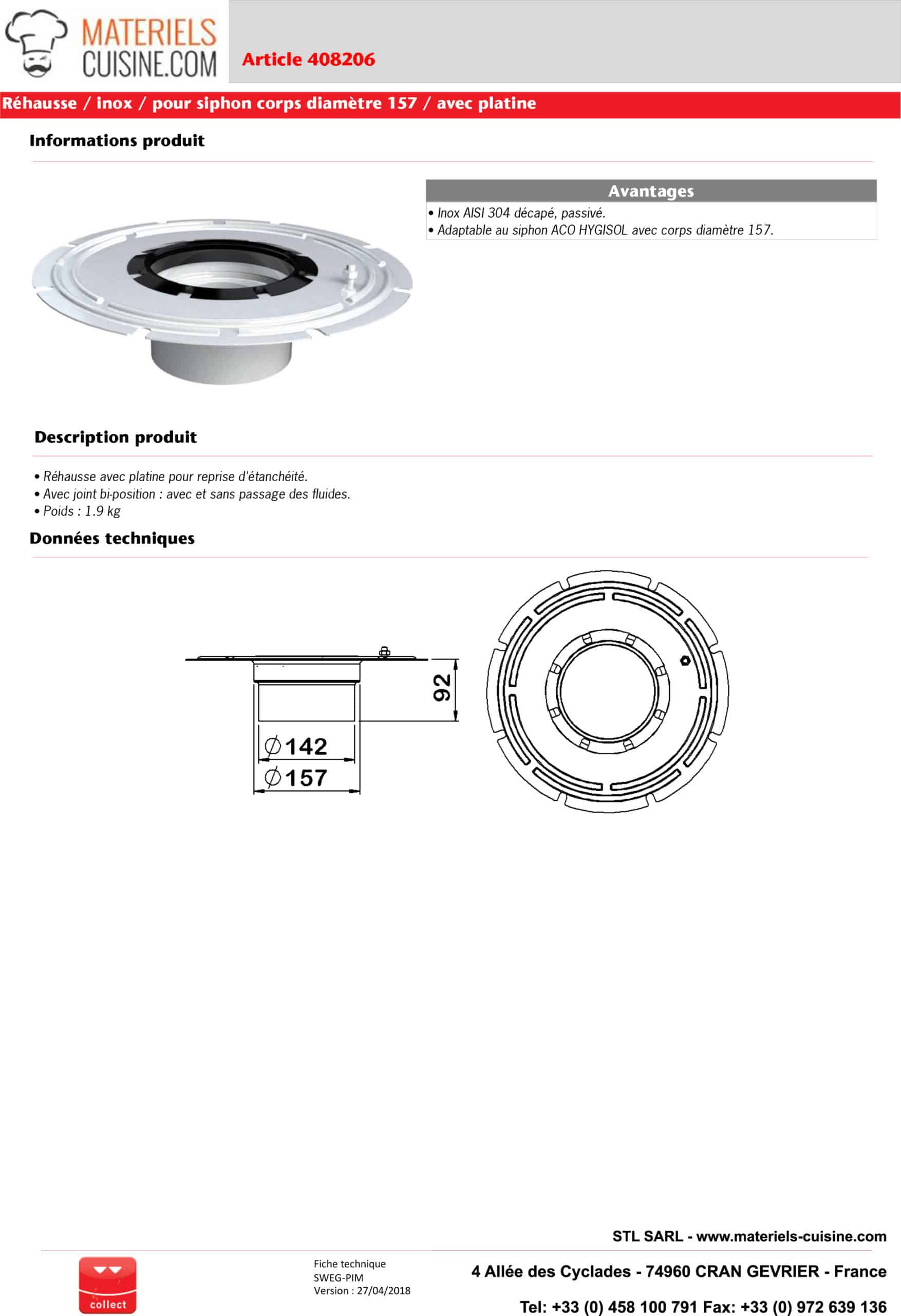 Adaptable au siphon ACO HYGISOL avec corps diamètre 157.