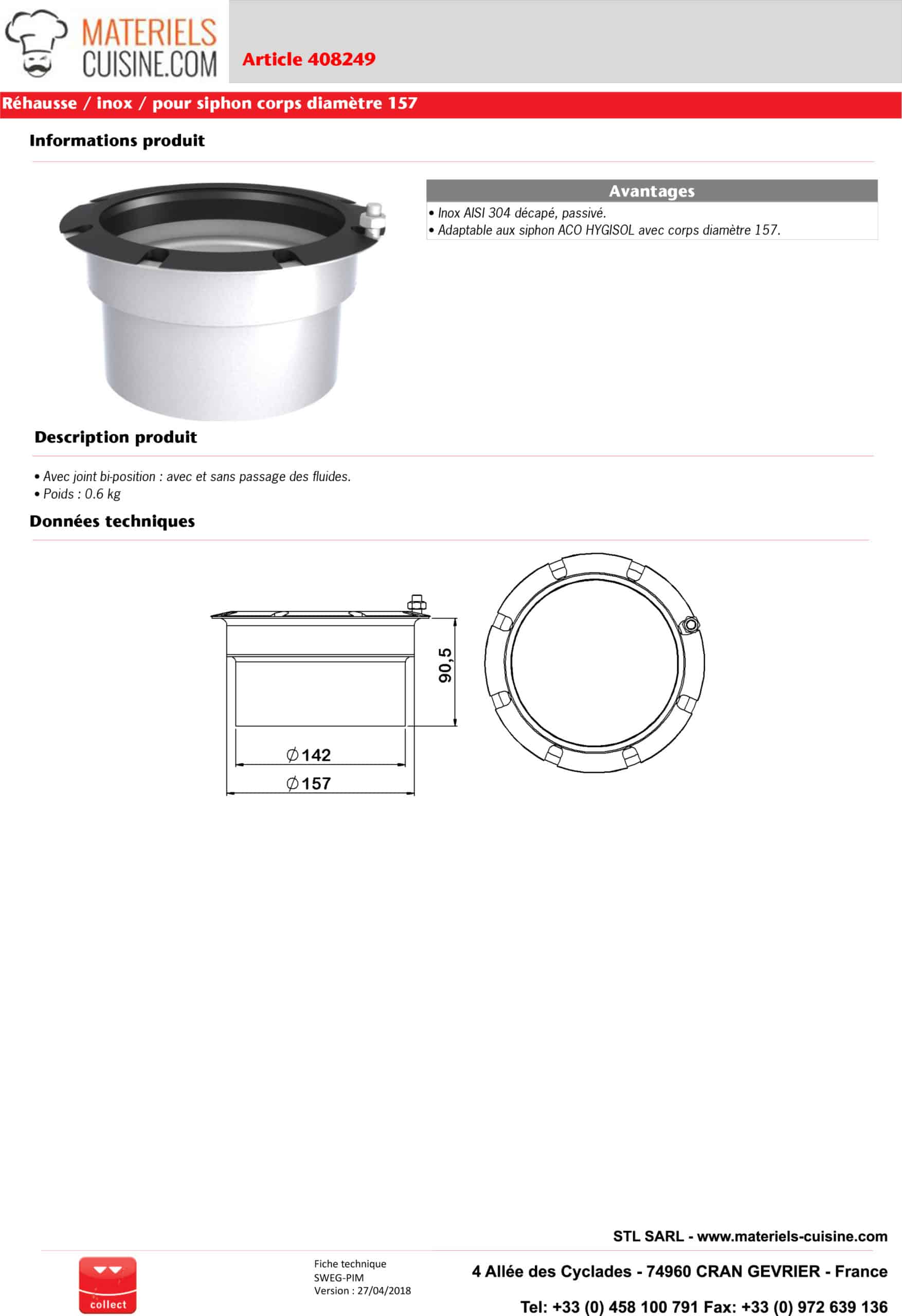 Adaptable aux siphon ACO HYGISOL avec corps diamètre 157.