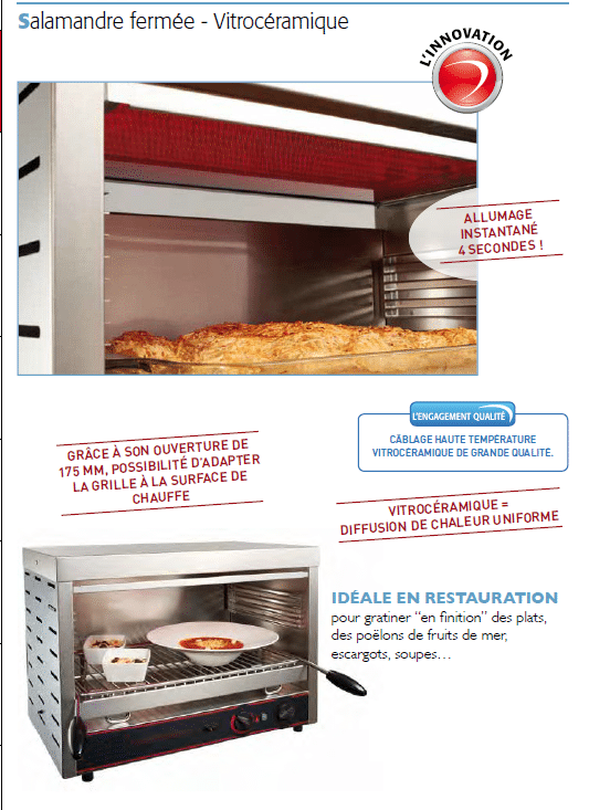 Salamandre inox 4000 W, conçue pour gratiner, griller et cuire par rayonnement, grâce à des résistances électriques blindées intégrées dans le plafond.