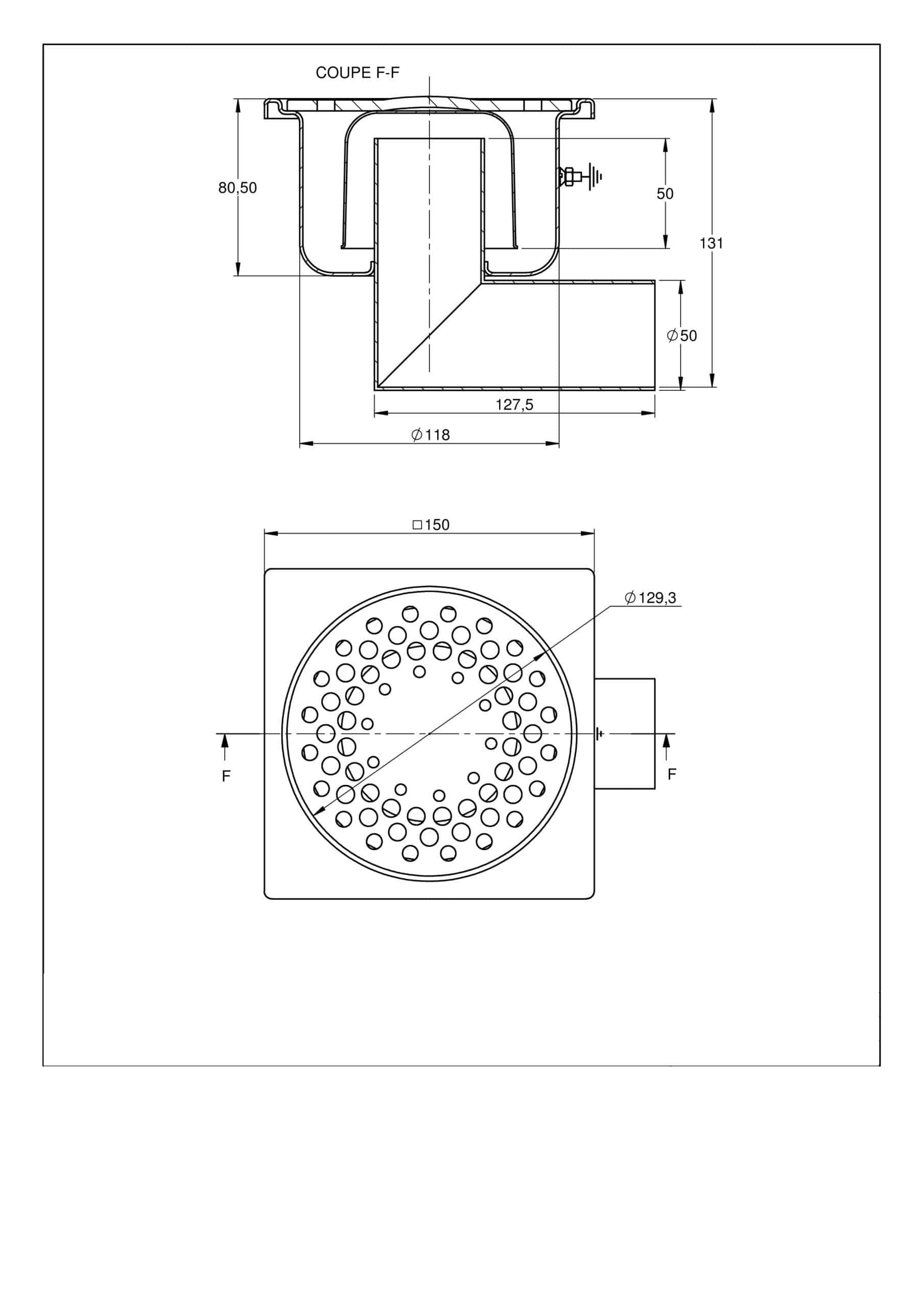 Siphon en acier inox avec prise de terre 150 x 150 mm sortie latérale Ø 50 mm
