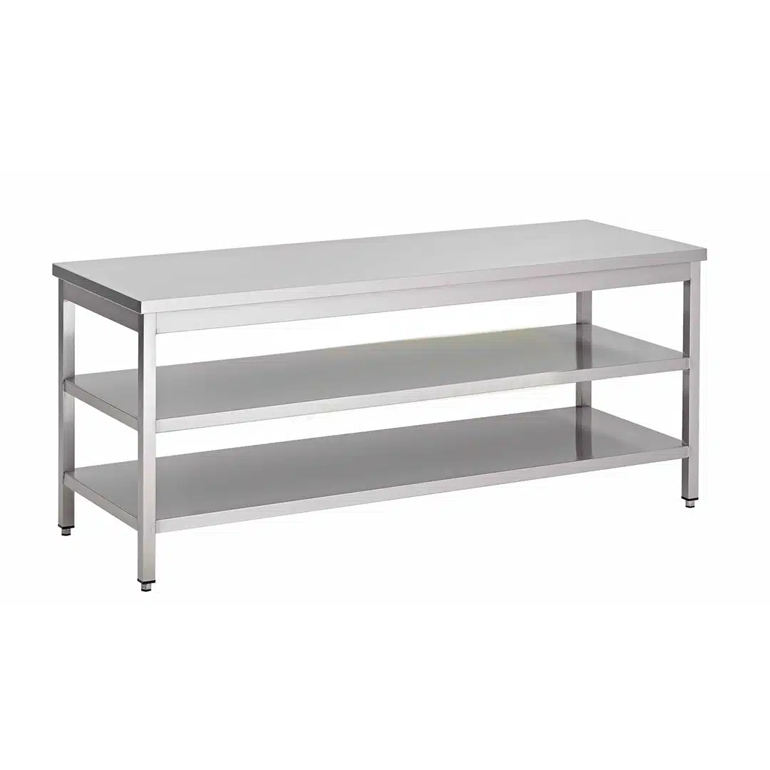Table centrale avec 2 étagères inférieures en INOX AISI 430, un matériel de qualité pour les professionnels de la restauration.