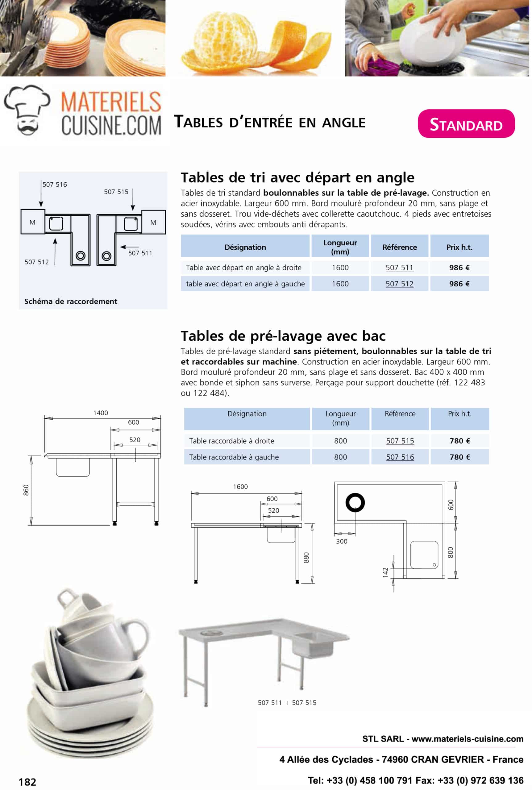 Tables de tri avec départ en angle + Tables de pré-lavage avec bac, en acier inoxydable